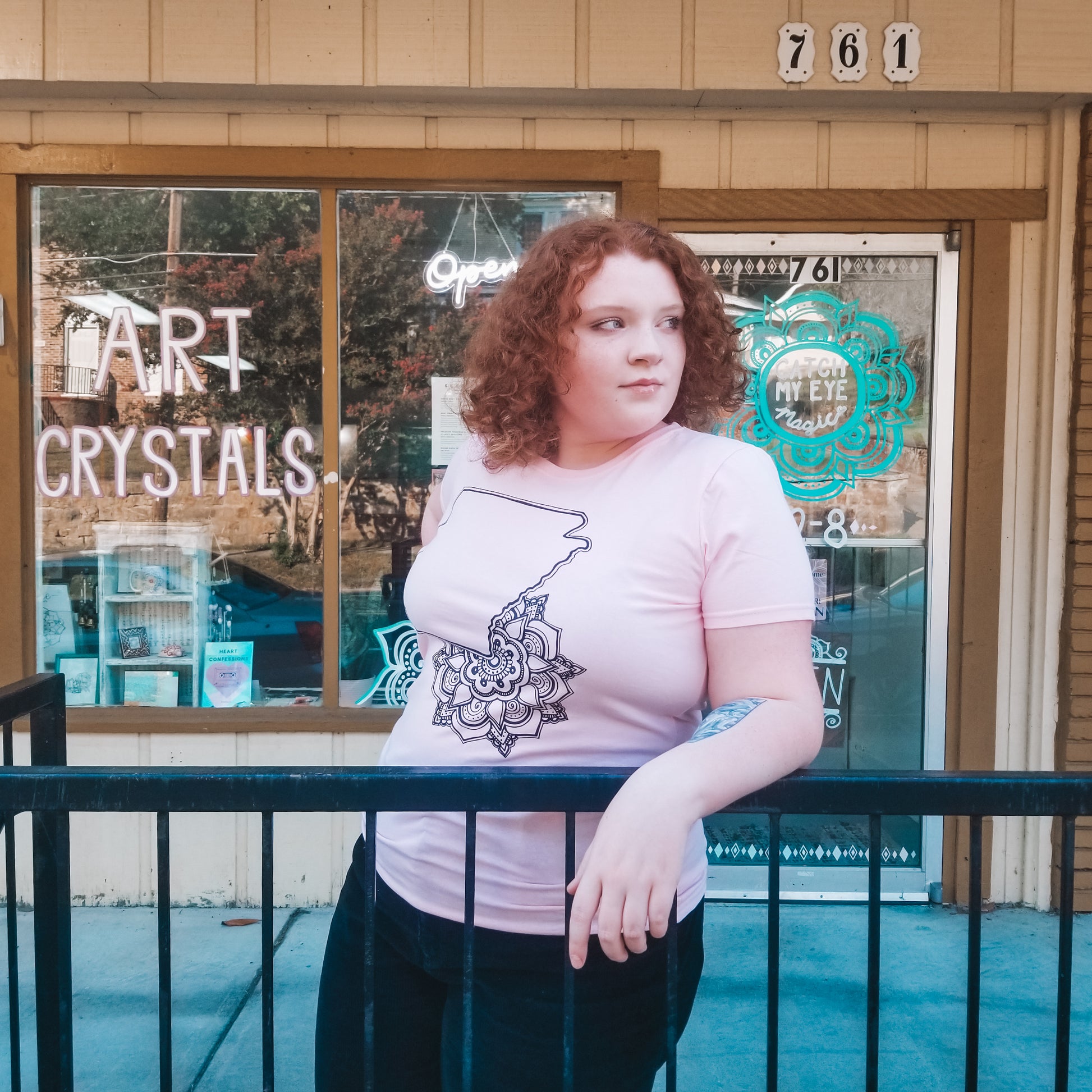 A pink female tshirt with the Arkansas Mandala design in white on top!
