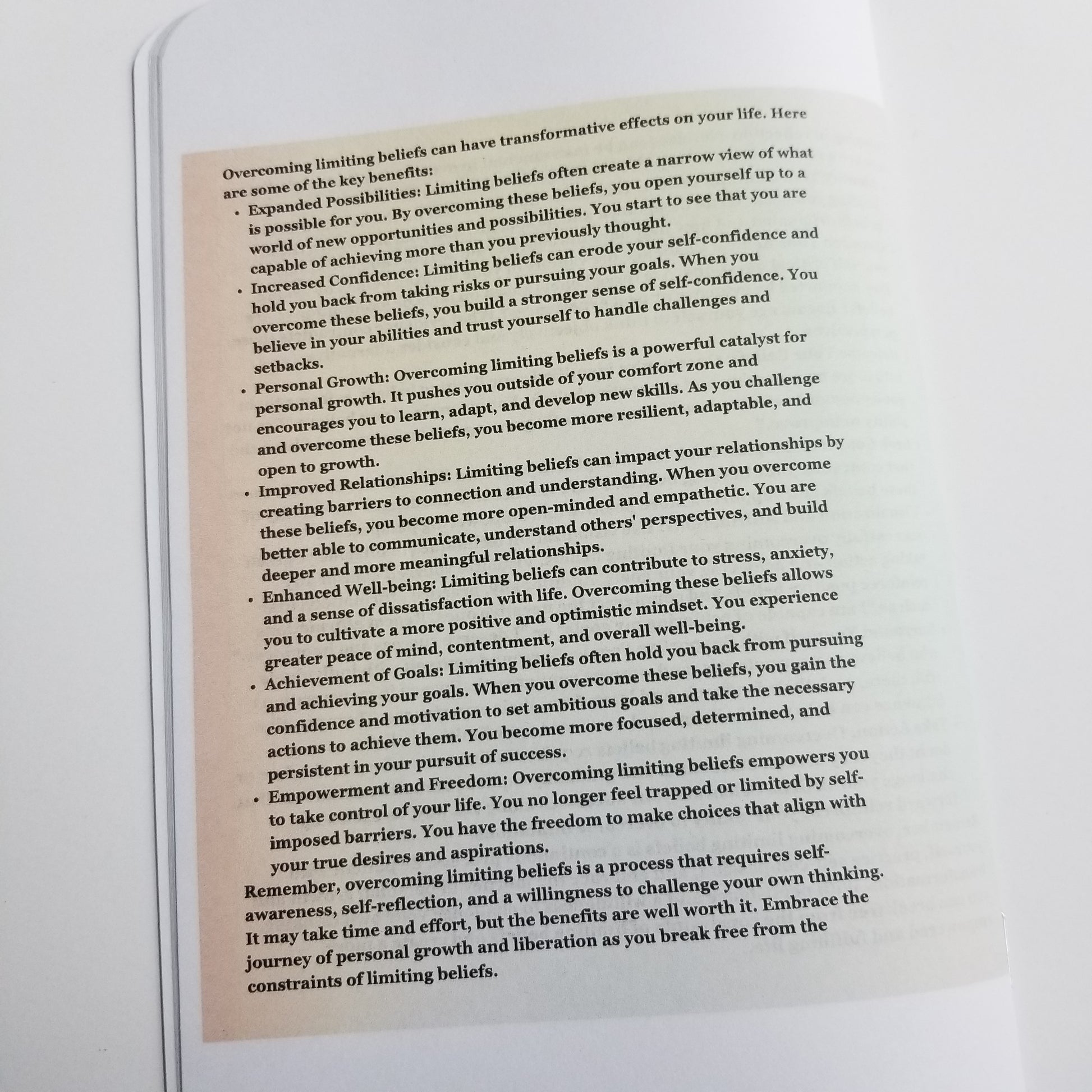 relationships, career, and overall quality of life.Each mini journal includes motivational quotes, journal prompts and reflection exercises. Overcoming limiting beliefs is a process that requires selfawareness, self-reflection, and a willingness to challenge your own thinking.