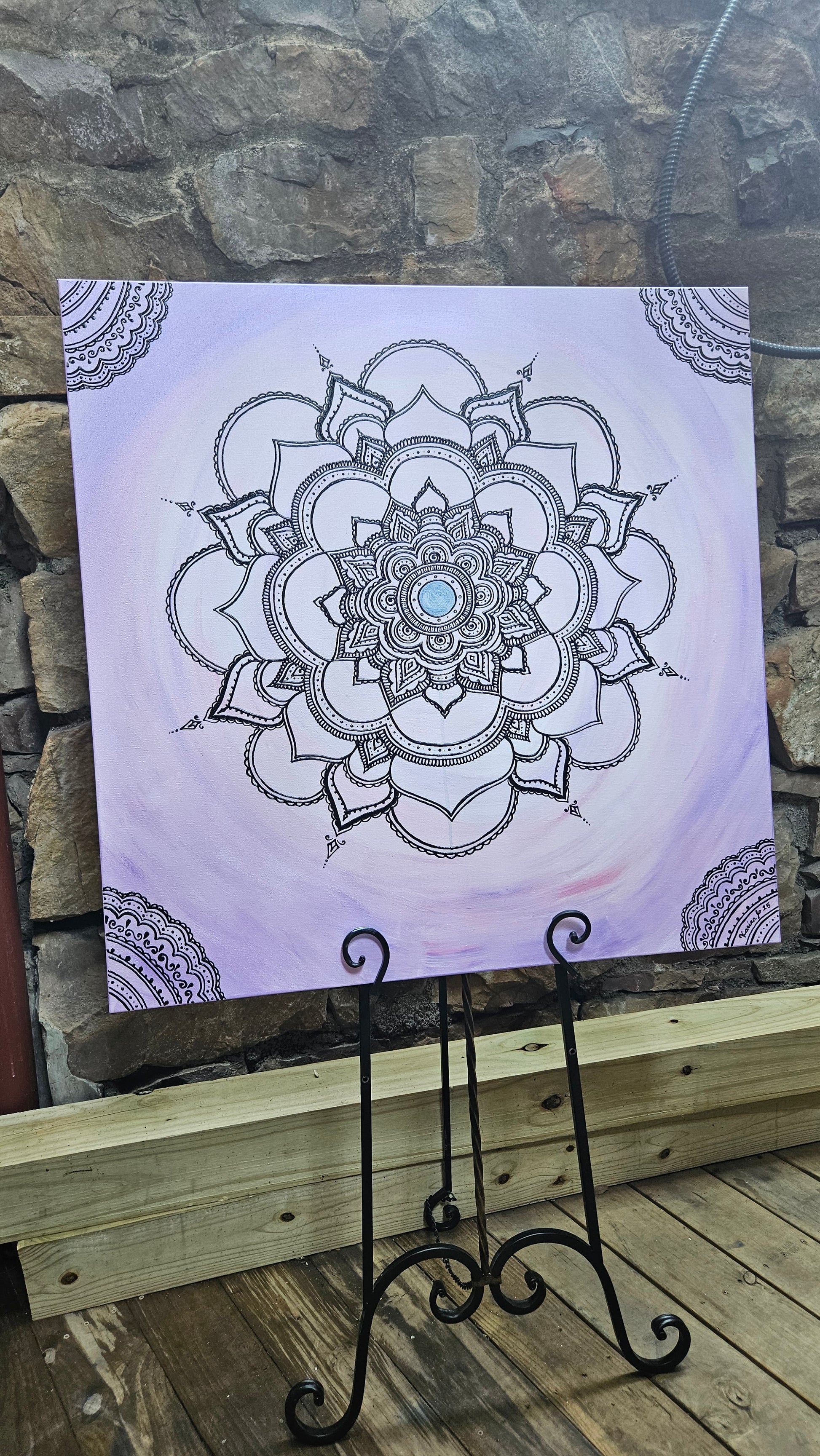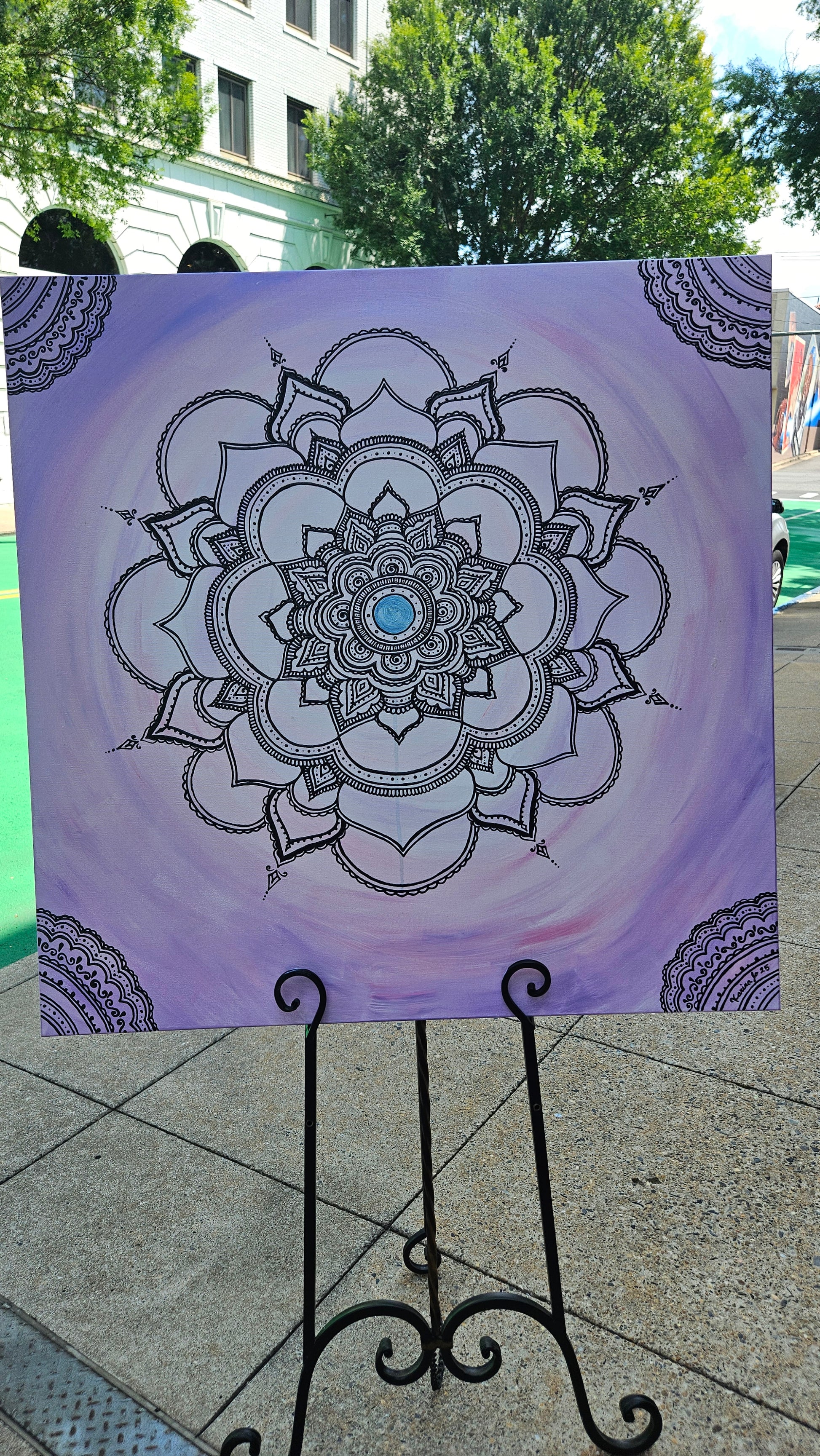 Enjoy the soft purples and pink tones behind a bold black lined freehand mandala painting 36x36" in size!